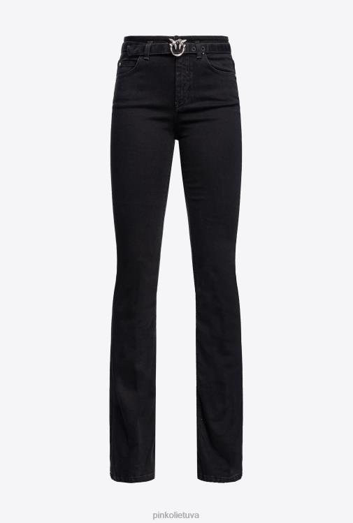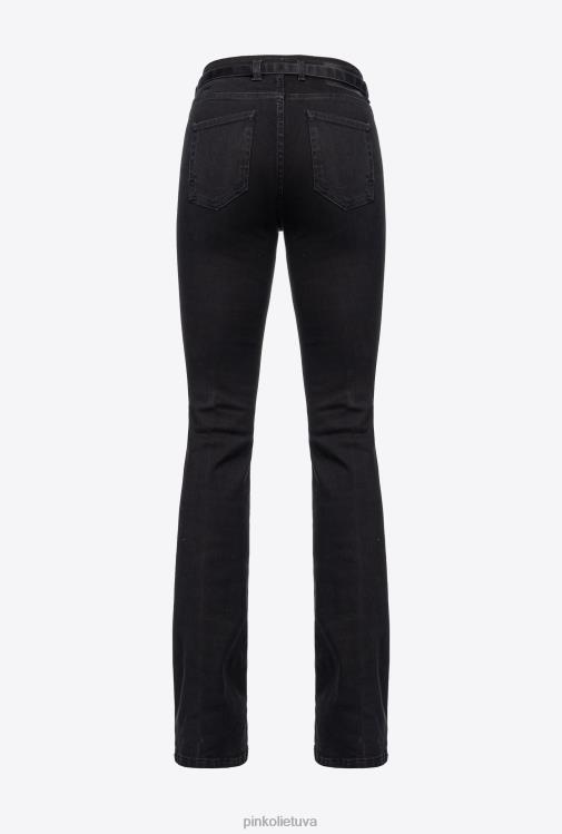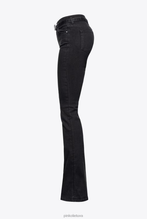 platėjantys penkių kišenių jeggings stiliaus džinsai iš juodo tampraus džinsinio audinio. įprastas juosmuo su diržo kilpomis, derančio audinio diržas su deimantine sagtimi ir plona koja, besiplečiančia link apačios. metalinis užtrauktukas ir užsegimas.