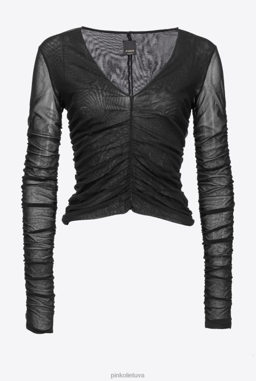 megztinis ilgomis rankovėmis V formos iškirpte iš pusiau permatomo tamprio tiulio audinio su visa drapiruota detale.