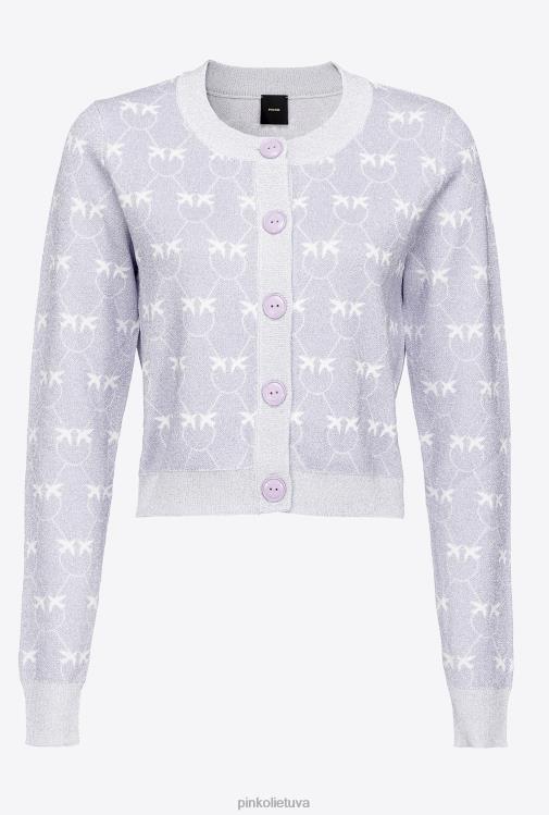 apkarpytas trikotažo viskozės ir lurekso megztinis su meilės paukščių monogramos raštu visame. apvaliu kaklu, ilgomis rankovėmis ir sagomis priekyje. - Modelis yra 175 cm ūgio ir dėvi 40 dydį.