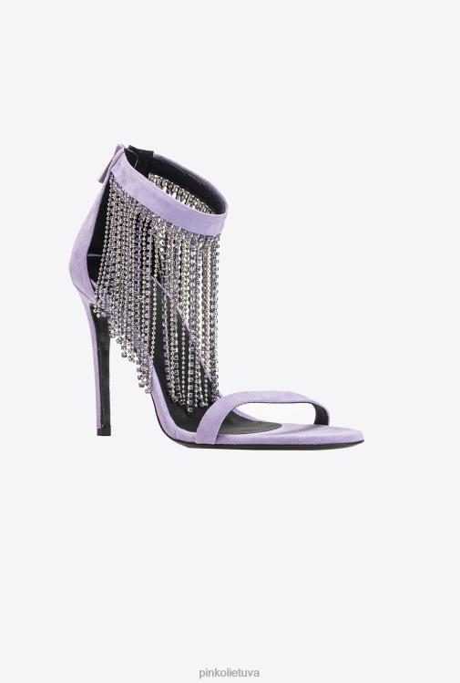 minkšti zomšiniai sandalai su dirželiu ant kulkšnies, papuoštu kalnų krištoliniu kutu. apvalus pirštas ir odinis padas su 10 cm aukštakulniu. paminkštintas odinis vidpadis ir kvėpuojantis mikropluošto pamušalas. užsegimas užtrauktuku ties kulnu.